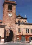 La piazza di San Giovanni come si presenta oggi con l’antica torre portaia che ospita ora l’orologio comunale. La torre portaia sopravissuta è stata sopraelevata per alloggiare il vano dell’orologio pubblico e denuncia la terminazione medievale con beccatelli allungati diversi da quelle delle mura. La nicchia rettangolare, al centro, ospitava una lapide, adesso rimossa, ma forse ancora rintracciabile perché spesso le lastre di marmo venivamo riutilizzate sull’altro lato, ad esempio in qualche altare.